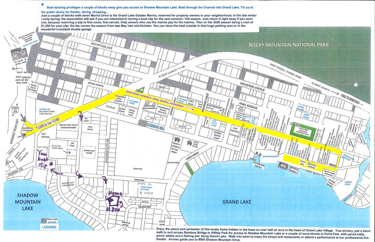 Enjoy the peace and seclusion of this lovely home nestled in the trees in the heart of Grand Lake Village on over half an acre. Offers great privacy yet is just a short walk to Point Park for access to Shadow Mountain Lake and Grand Lake. Walk into town to enjoy the shops and restaurants or attend a performance at the local repertory theater. Vaulted ceilings with large windows to bring in the blue skies and sunshine. Three bedrooms, three baths. Lower level is partially finished with a 2nd living area. Oversized garage is 728 square feet with paved driveway. Lots of room for all your toys plus the ability to sign up for a boat dock in the Grand Lake Estates Marina. Large covered deck with a grand stone fireplace.