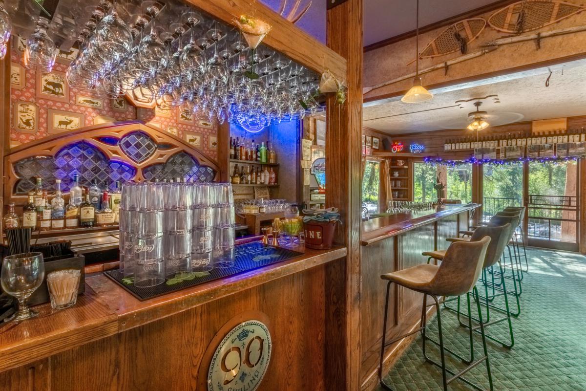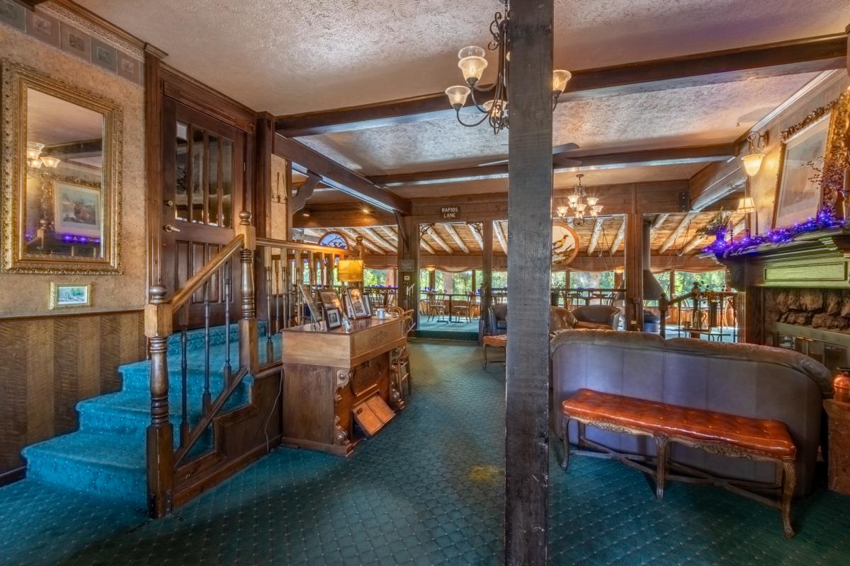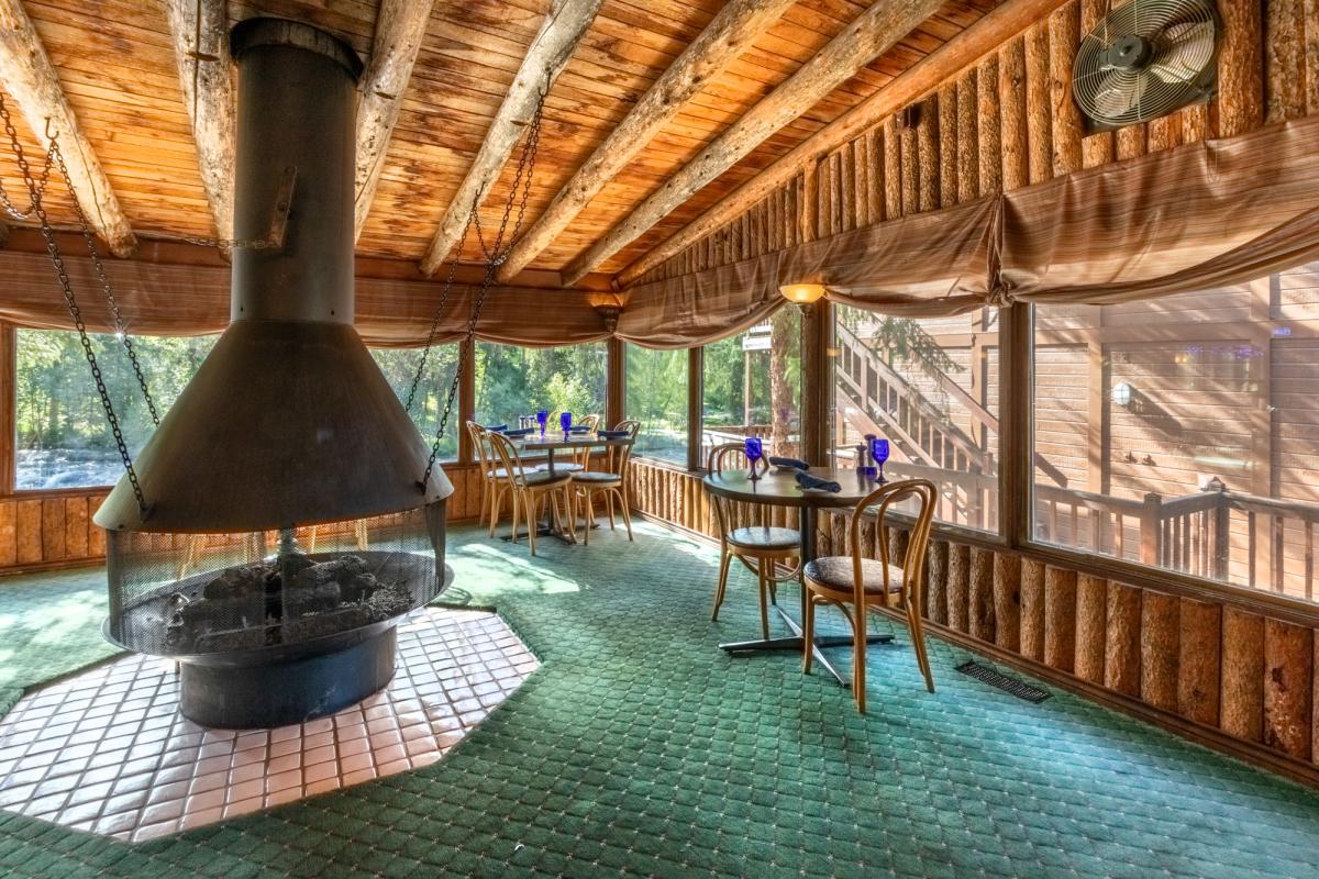 What a location! As you look through the photos on the link farther below, imagine the dining room as a marvelous waterfront living room with the banquet room on the far side of the main level as the dining room or as a separate big family room or music room. With the two fireplaces, you could create smaller reading nooks or streamside game tables. The commercial kitchen really opens up possibilities in cooking for your large family; there are talented local chefs whom you can hire to come in and prepare meals for you, as well.